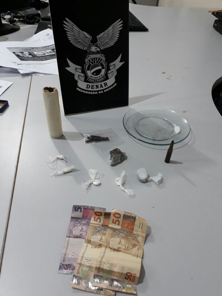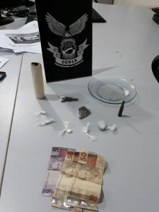 Após monitoramento ao local, foi detido um usuário e o suspeito, sendo realizadas buscas em sua casa, na qual ele alegou não haver entorpecente, contudo foi localizada 1 porção de maconha e 4 de cocaína, todas já prontas para a venda, além de dinheiro e petrechos para preparo da droga.