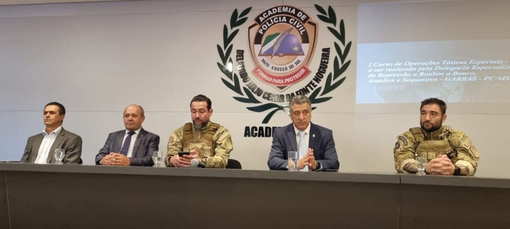 Campo Grande (MS): A Polícia Civil, por intermédio da Delegacia Especializada de Repressão a Roubo a Banco, Assaltos e Sequestros (Garras) e a Academia de Polícia Civil Delegado Júlio César da Fonte Nogueira (Acadepol) deu início, nesta segunda-feira (3), ao 1º Curso de Operações Táticas Especiais (COTE), em cerimônia que contou com a presença do diretor da Acadepol – delegado Devair Aparecido Francisco; do diretor do Departamento de Polícia Especializada – delegado Edilson dos Santos Silva, do delegado titular do Garras – Fábio Peró e do coordenador do COTE – Investigador Fabiano Alécio Manfrin, diversas autoridades, “coteanos” e familiares.