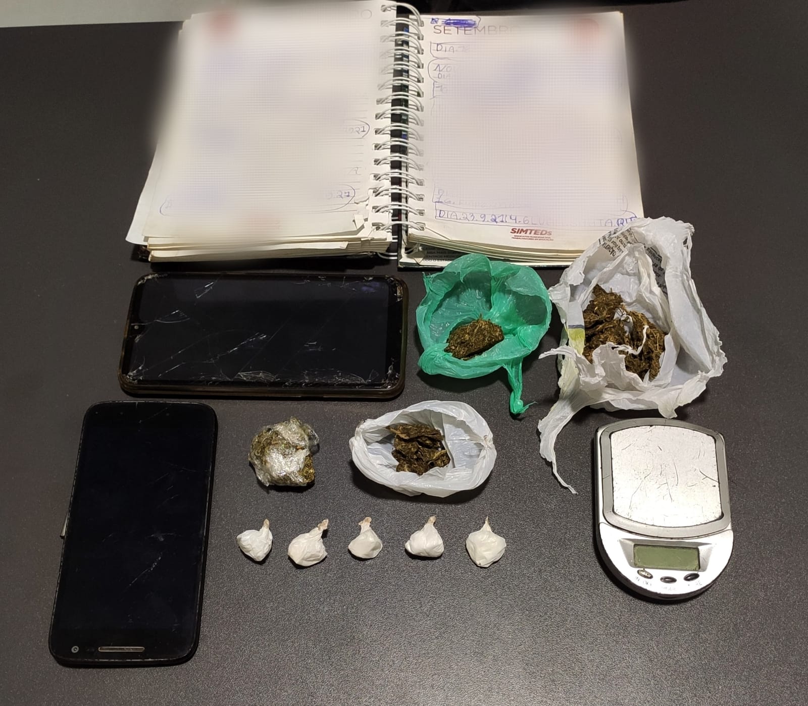 Os policiais fizeram busca na residência e localizaram um papelote de maconha envolvido em plástico filme, bem como outra trouxinha de maconha e cinco paradinhas de cocaína, já prontas para venda, pesando aproximadamente 1g cada. Na casa havia ainda uma balança de precisão e um caderno de anotações, onde continham inúmeras anotações características de vendas de entorpecentes, citando nome, peso da droga e se tinha pago ou não, bem como o valor recebido.