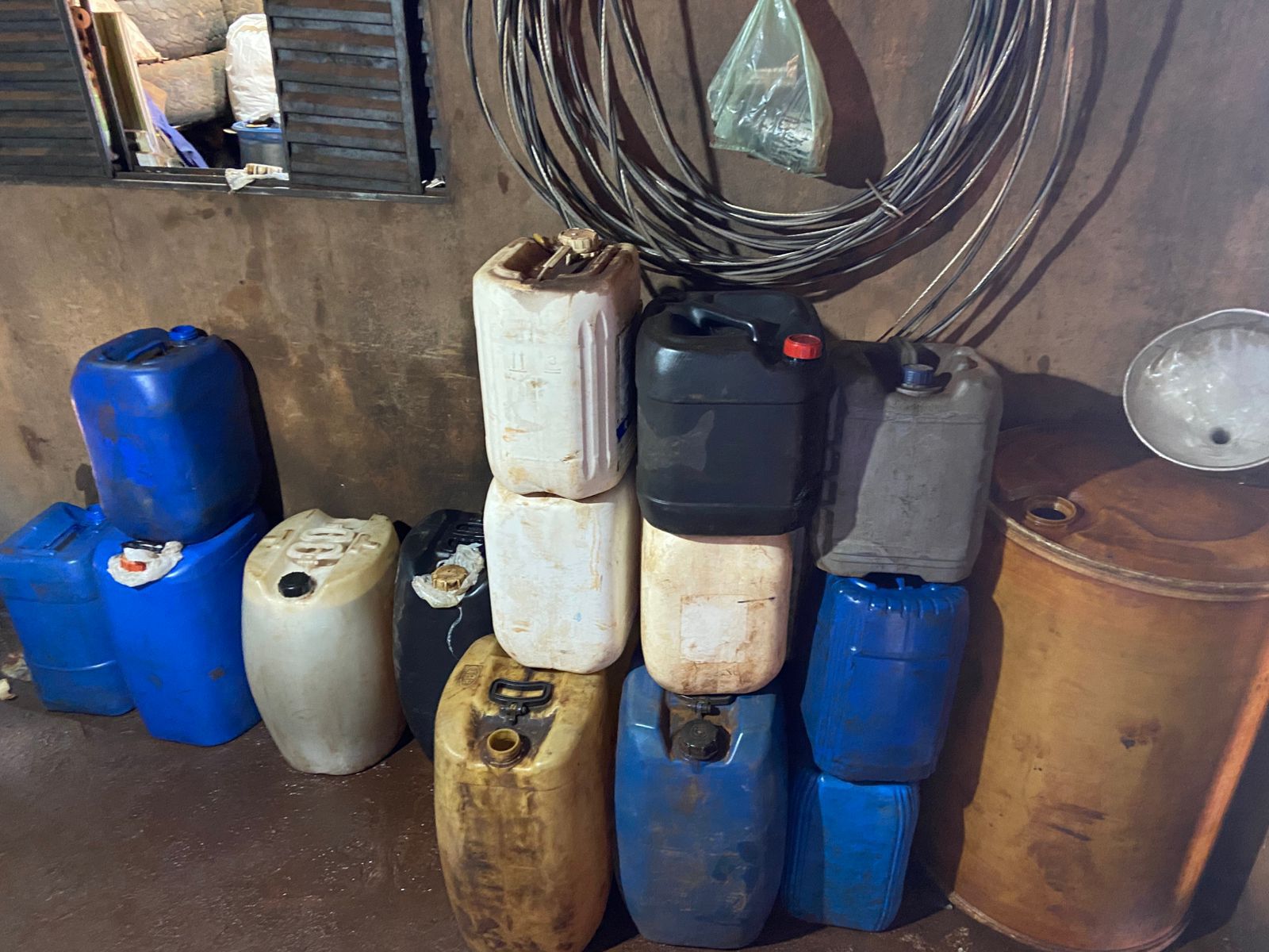 Durante a diligência, os policiais identificaram, já na parte externa do local, diversos galões plásticos vazios, comumente utilizados para o transporte de combustíveis. Em razão das fundadas razões, foi realizada vistoria em um cômodo nos fundos do imóvel, onde foram encontrados galões contendo gasolina, etanol e óleo diesel, totalizando aproximadamente 1.150 litros de combustíveis automotivos, todos armazenados sem qualquer tipo de controle técnico ou autorização legal.