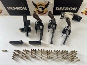 Diante dos fatos, o autor foi encaminhado à DEFRON, junto com as armas, munições e veículos. Ele foi autuado em flagrante pelos crimes de comércio ilegal de armas de fogo e receptação.