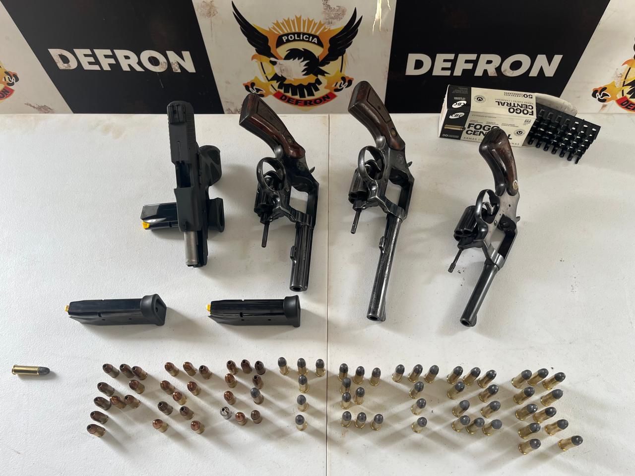 Após ser informado sobre a denúncia e seus direitos constitucionais, foi realizada uma busca em seu veículo, resultando na apreensão de um revólver Taurus calibre .38, com cinco munições intactas. Em seguida, o autor indicou sua residência, onde foram localizadas mais armas de fogo, incluindo uma pistola Taurus G2C calibre 9mm e dois revólveres, além de várias munições.