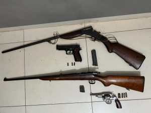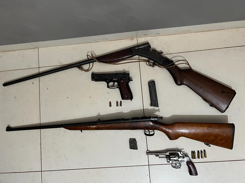 Foram apreendidas 4 armas de fogo, sendo 01 pistola marca Taurus PT 57 S AMF calibre 7.65mm com 01 carregador, 01 revólver marca Taurus calibre .32mm, 01 espingarda calibre .22 Itajubá e 01 espingarda calibre .32 S/M, além de 13 munições de calibres diversos, correspondentes às armas apreendidas.