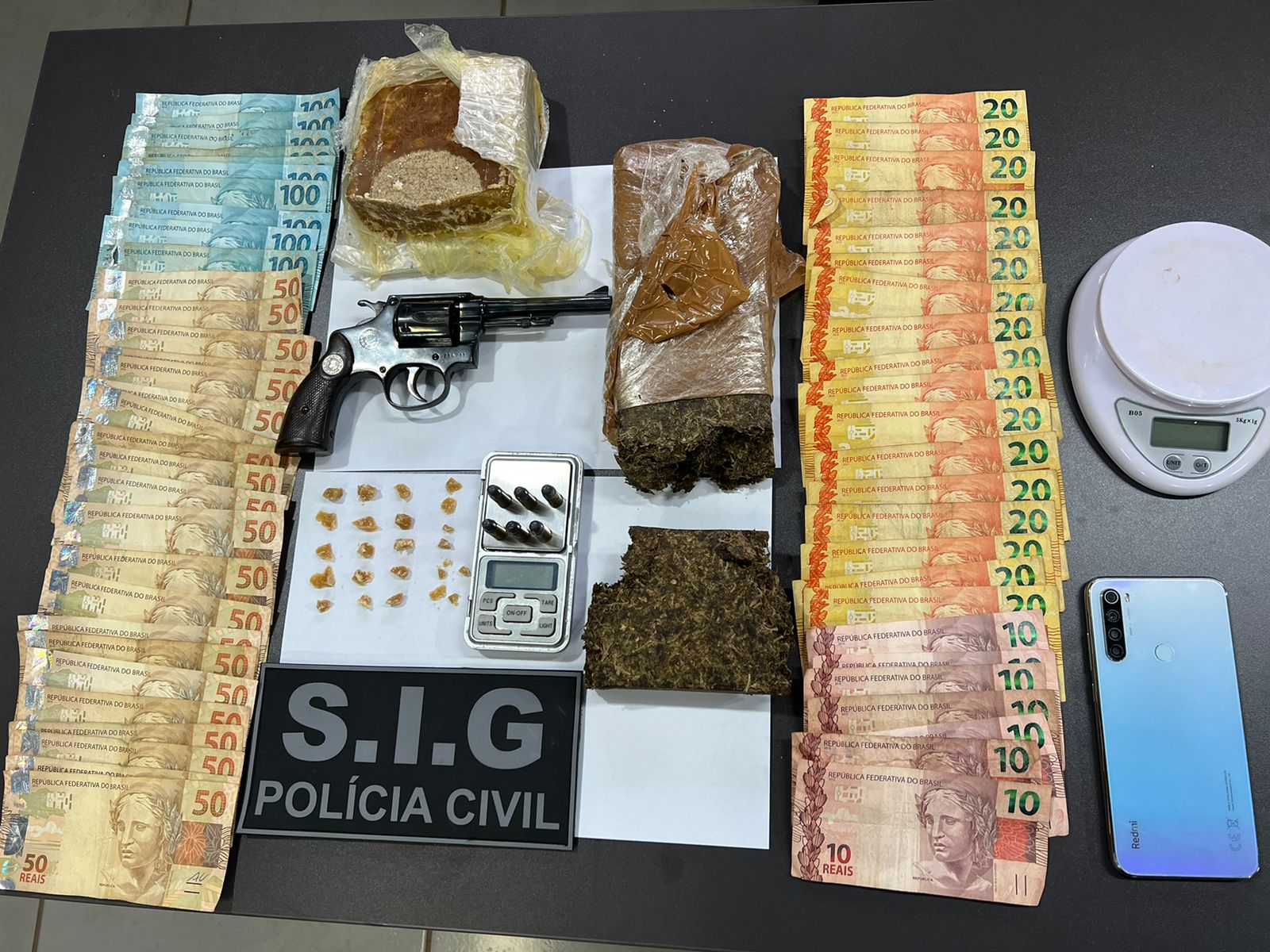 Diante da situação flagrancial foi realizada incursão no imóvel, oportunidade em que foram encontrados em posse do investigado 1 pedra bruta de crack, pesando aproximadamente 543 gramas; 28 porções de crack, pesando 8 gramas; dois tabletes de maconha, as quais pesaram 689 gramas; 2 balanças de precisão; 1 revólver, cal. 32, municiado e cédulas de dinheiro nacional, fracionadas. O homem foi autuado em flagrante e confessou a prática dos crimes.