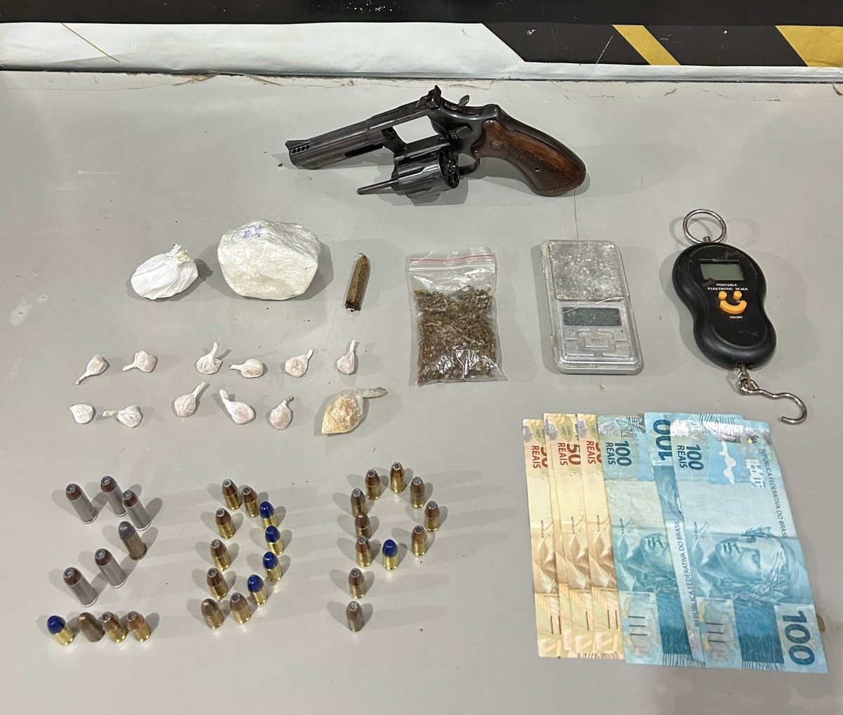 Durante a abordagem policial, o investigado tentou quebrar um aparelho celular e engolir algumas porções de droga que estavam em sua posse, na tentativa de ocultar evidências sobre a traficância. Após buscas na residência do autor, a equipe localizou diversas porções de crack, aproximadamente 120g de cocaína, uma porção de maconha, um revólver calibre .357 e 32 munições de calibres diversos, além de dinheiro e 2 balanças de precisão.