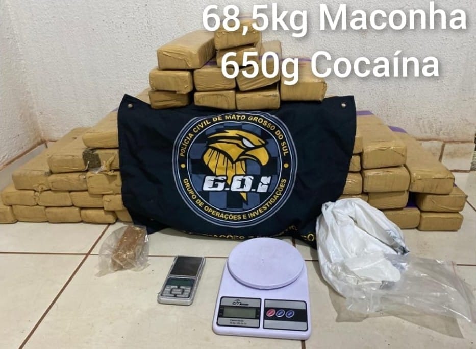Segundo apurado, após recebimento de denúncias anônimas, uma equipe do GOI foi até o local onde a droga estaria sendo guardada e encontraram o pai do suspeito. Foi franqueada a entrada dos policiais na residência e no quarto dos fundos foram encontrados 68,5kg de maconha, 650g de cocaína e duas balanças de precisão.