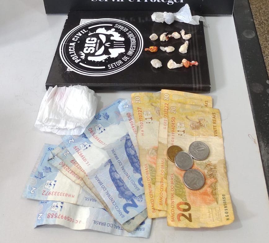 Confirmando as suspeitas da mercancia de drogas, em estado flagrancial, os policiais civis abordaram o autor de 29 anos de idade e com eles apreenderam 10 porções de crack (totalizando cerca de 2g), já individualizadas e prontas para venda, além da quantia de R$ 79,15 em cédulas e moedas de valores diversos, embalagens plásticas para embalar a droga, aparelho celular e caderno de anotações.