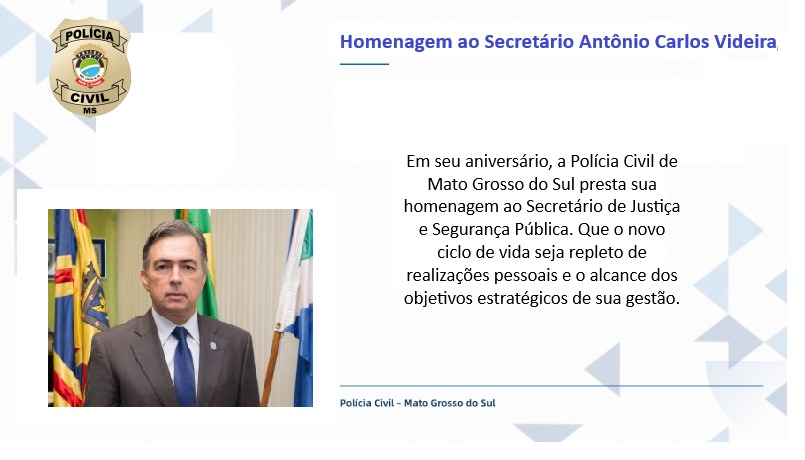Em seu aniversário, a Polícia Civil de Mato Grosso do Sul presta sua homenagem ao Secretário de Justiça e Segurança Pública. Que o novo ciclo de vida seja repleto de realizações pessoais e o alcance dos objetivos estratégicos de sua gestão.