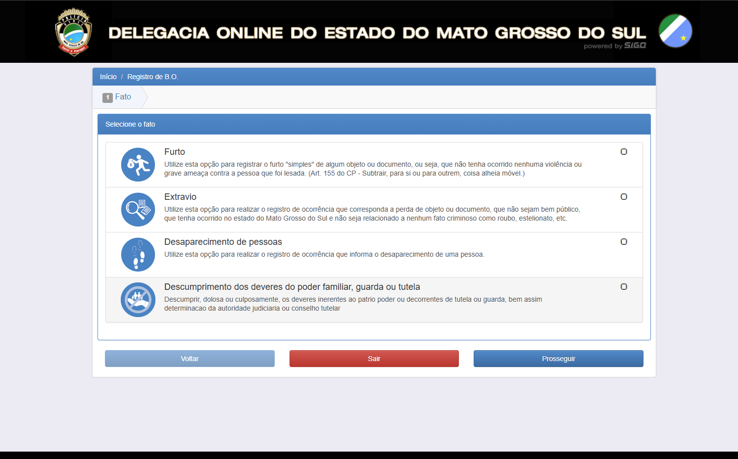 Passou a fazer parte do rol de boletins de ocorrência que podem ser registrados de forma on-line no site pc.ms.gov.br, o descumprimento dos deveres do poderes familiar, guarda e tutela de crianças e adolescentes que trata da infração administrativa do artigo 249, ECA: Descumprir, dolosa ou culposamente, os deveres inerentes ao poder familiar ou decorrente de tutela ou guarda, bem assim determinação da autoridade judiciária ou Conselho Tutelar.