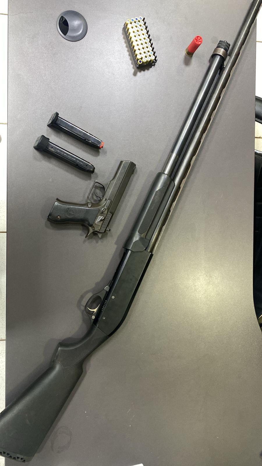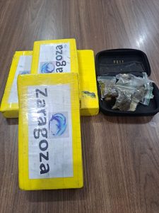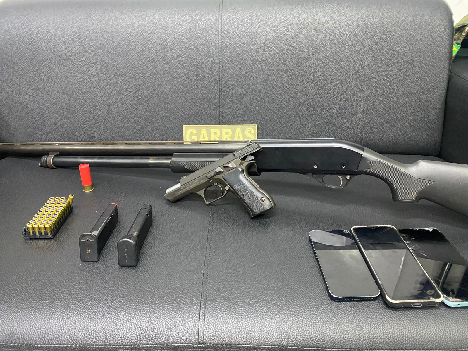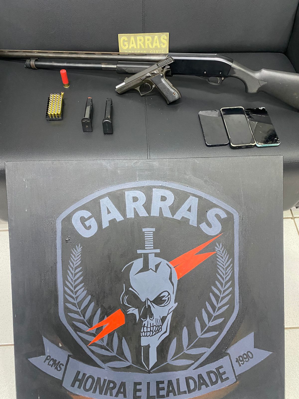 Durante as buscas, foram apreendidos quatro tabletes de cocaína e R$ 15 mil em espécie, proveniente da venda de parte da cocaína. Na continuidade das buscas, os policiais identificaram outra residência também utilizada por L.P.C. Neste segundo local havia duas armas de fogo, sendo uma pistola calibre 9mm importada e uma espingarda calibre .12.