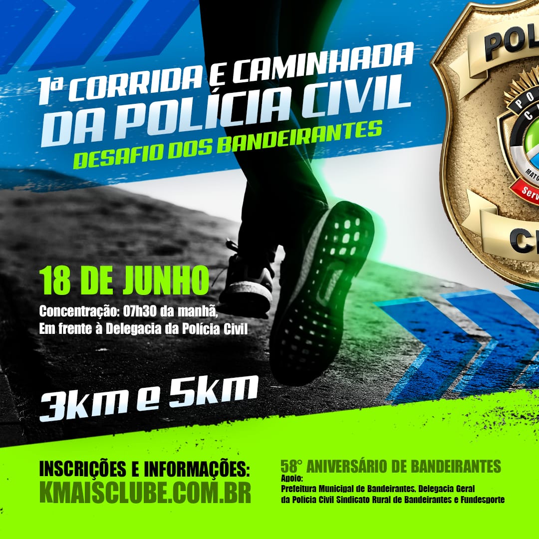 O evento será realizado no dia 18/06/2023, com largada às 08 horas, em frente à Delegacia de Polícia Civil de Bandeirantes. Haverá percurso de 3Km para caminhada e 5Km para corrida.