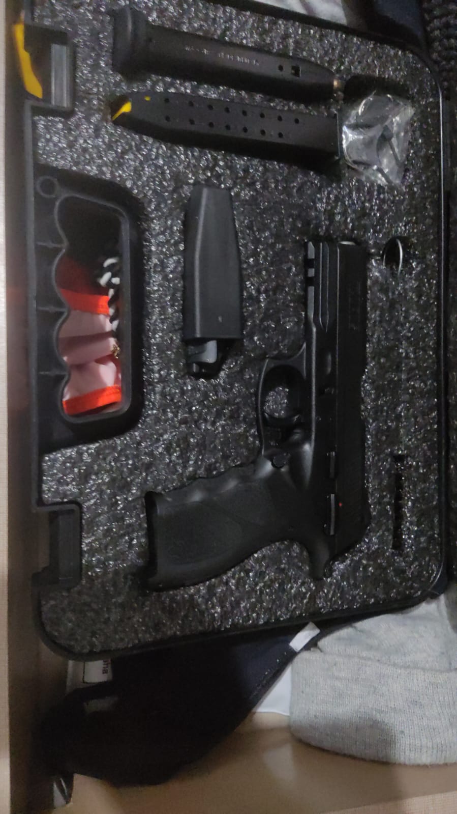 D.T.A.S. (38), alvo da investigação policial, foi surpreendida em sua casa no bairro Nova Lima, de posse de uma arma de fogo calibre .9mm e 10 munições do mesmo calibre.