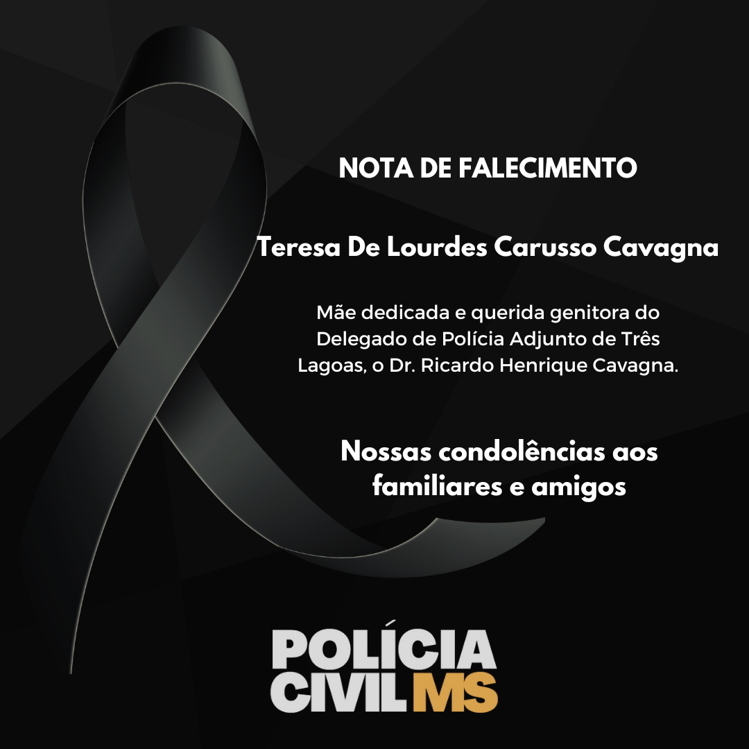 Com profundo pesar, comunicamos o falecimento da senhora Teresa De Lourdes Carusso Cavagna, aos 83 anos de idade. Mãe dedicada e querida genitora do Delegado de Polícia Adjunto de Três Lagoas, o Dr. Ricardo Henrique Cavagna.