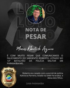 É com imenso pesar que comunicamos o falecimento do policial militar, Sargento Marcos Roberto de Aquino, lotado no 13º Batalhão da Polícia Militar em Paranaíba-MS. O militar tinha 49 anos de idade e era casado com a Escrivã de Polícia Civil Katiúscia Parreira, lotada na DAM (Delegacia de Atendimento à Mulher), em Paranaíba.