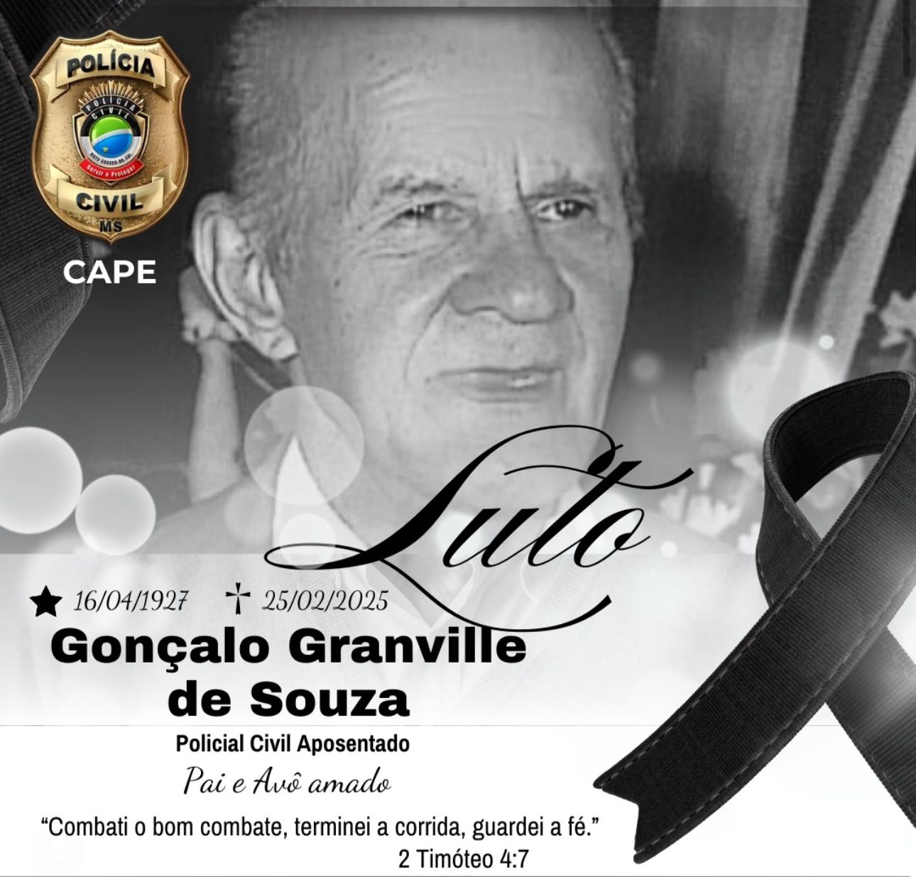 É com grande pesar que comunicamos o falecimento do Policial Civil aposentado Gonçalo Graville de Souza, aos 97 anos. Ele é pai do policial civil aposentado Gonçalo Granville de Souza Filho e avô da policial civil e psicóloga Fabiana Souza Pedraza, lotada no Coordenadoria de Apoio Psicossocial e Espiritual (CAPE).