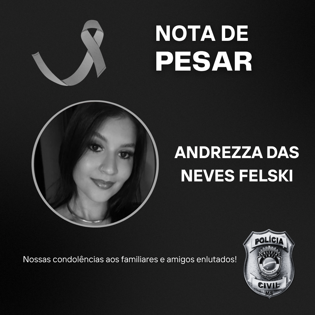 É com imenso pesar que comunicamos o falecimento de Andrezza das Neves Felski, de 27 anos, namorada do delegado Elton Alves de Sá Júnior, lotado na 1ª Delegacia de Corumbá. Ela foi vítima de um acidente grave, de trânsito, ocorrido próximo à região do “Buraco das Piranhas”, a cerca de 110 km de Corumbá-MS. Os dois estavam em um ônibus de viagem que colidiu com um caminhão.
