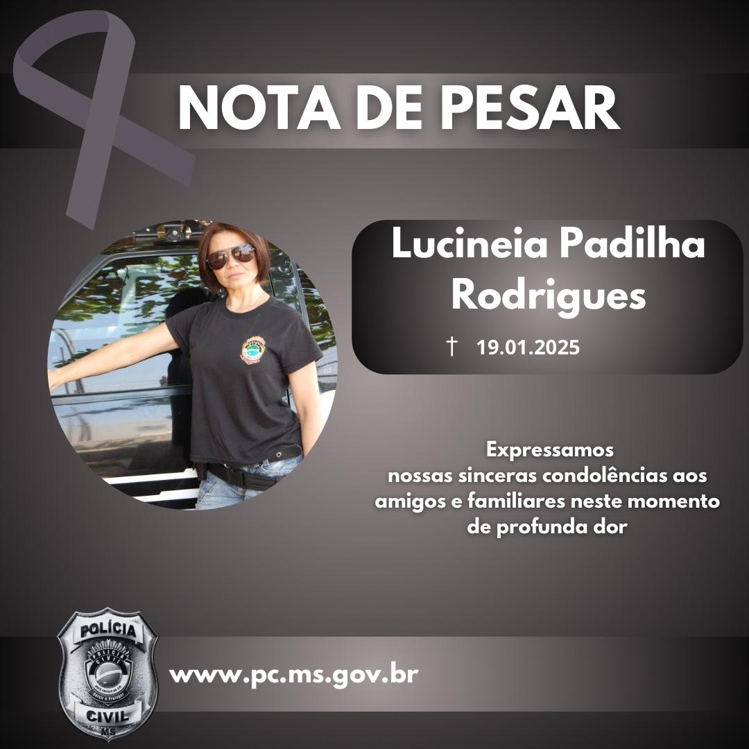 A Polícia Civil de Mato Grosso do Sul manifesta seu profundo pesar pelo falecimento da Investigadora de Polícia Judiciária Lucineia Padilha Rodrigues, de 58 anos, ocorrido nesta manhã, 19 de janeiro de 2025.