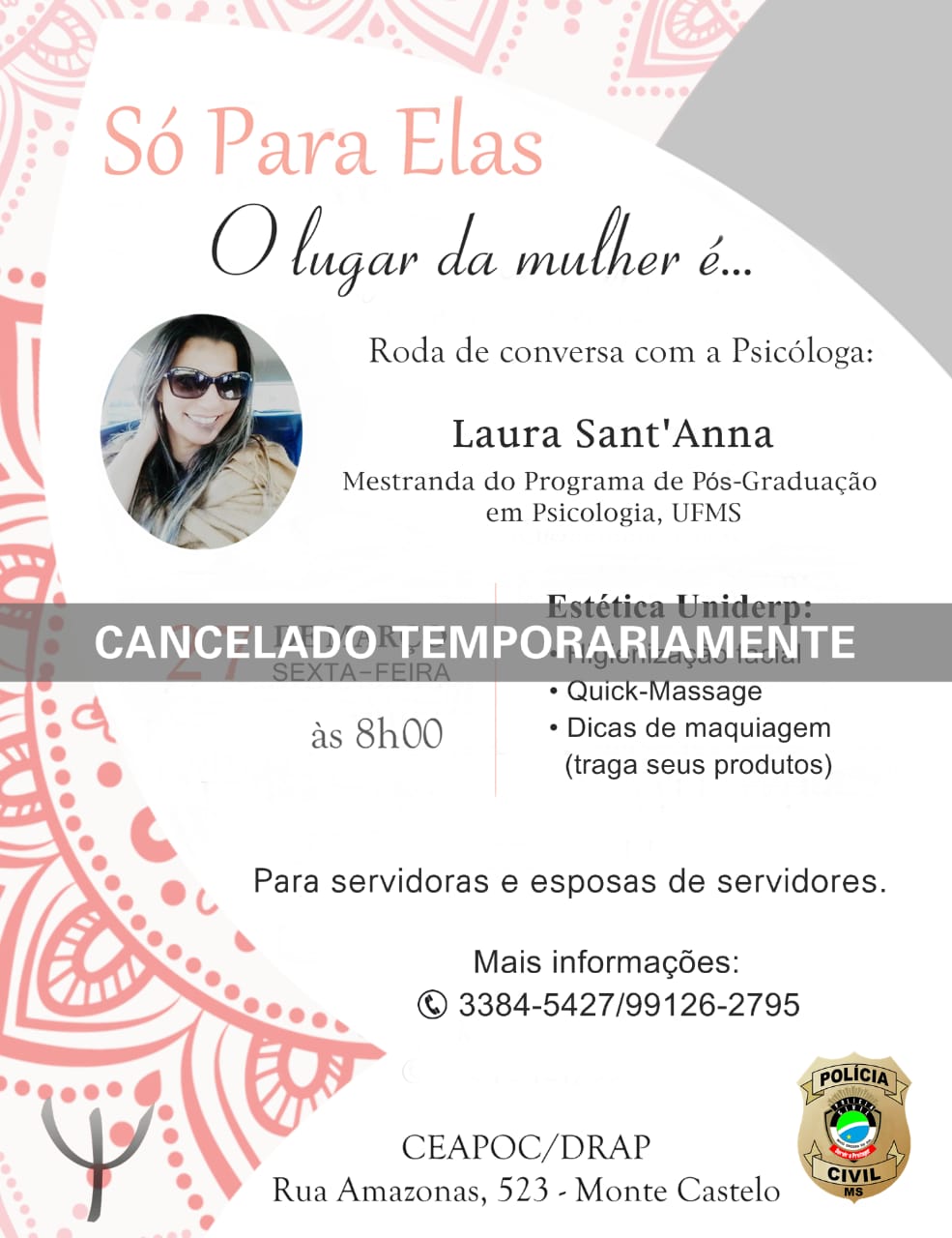 Campo Grande (MS): A roda de conversa “Só Para Elas – O lugar da mulher é…”, com a psicóloga Laura Sant’Anna, que seria realizada pela Coordenadoria de Atendimento Psicossocial (Ceapoc), no dia 27 de março, em Campo Grande, teve que
