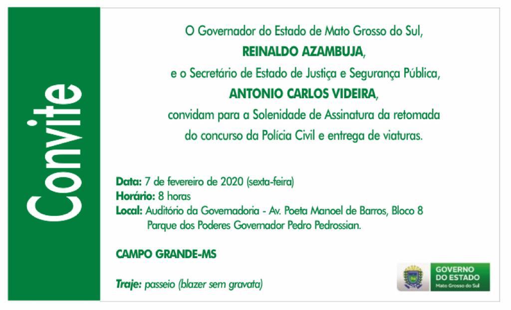 Campo Grande (MS): O Governador do Estado, Reinaldo Azambuja, e o Secretório de Justiça e Segurança Pública, Antônio Carlos Videira, irão realizar, na manhã de sexta-feira, 7 de fevereiro de 2020, às 8 horas, no Auditório da Governadoria, cerimônia