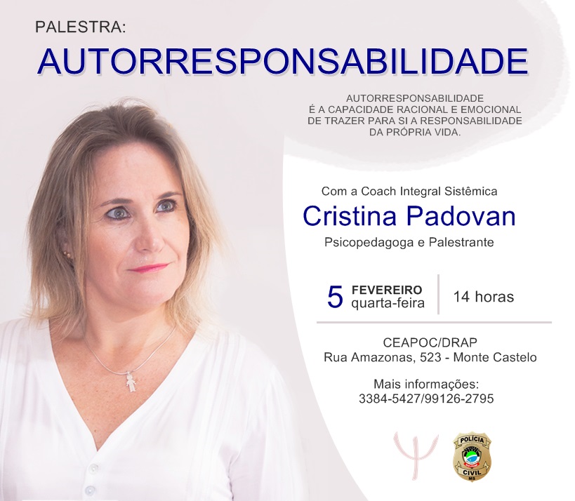 Campo Grande (MS): A Polícia Civil por meio da Coordenadoria de Atendimento Psicossocial da Polícia Civil – CEAPOC/DRAP convida servidores e seus familiares para participarem da palestra: Autorresponsabilidade, que será ministrada por Cristina