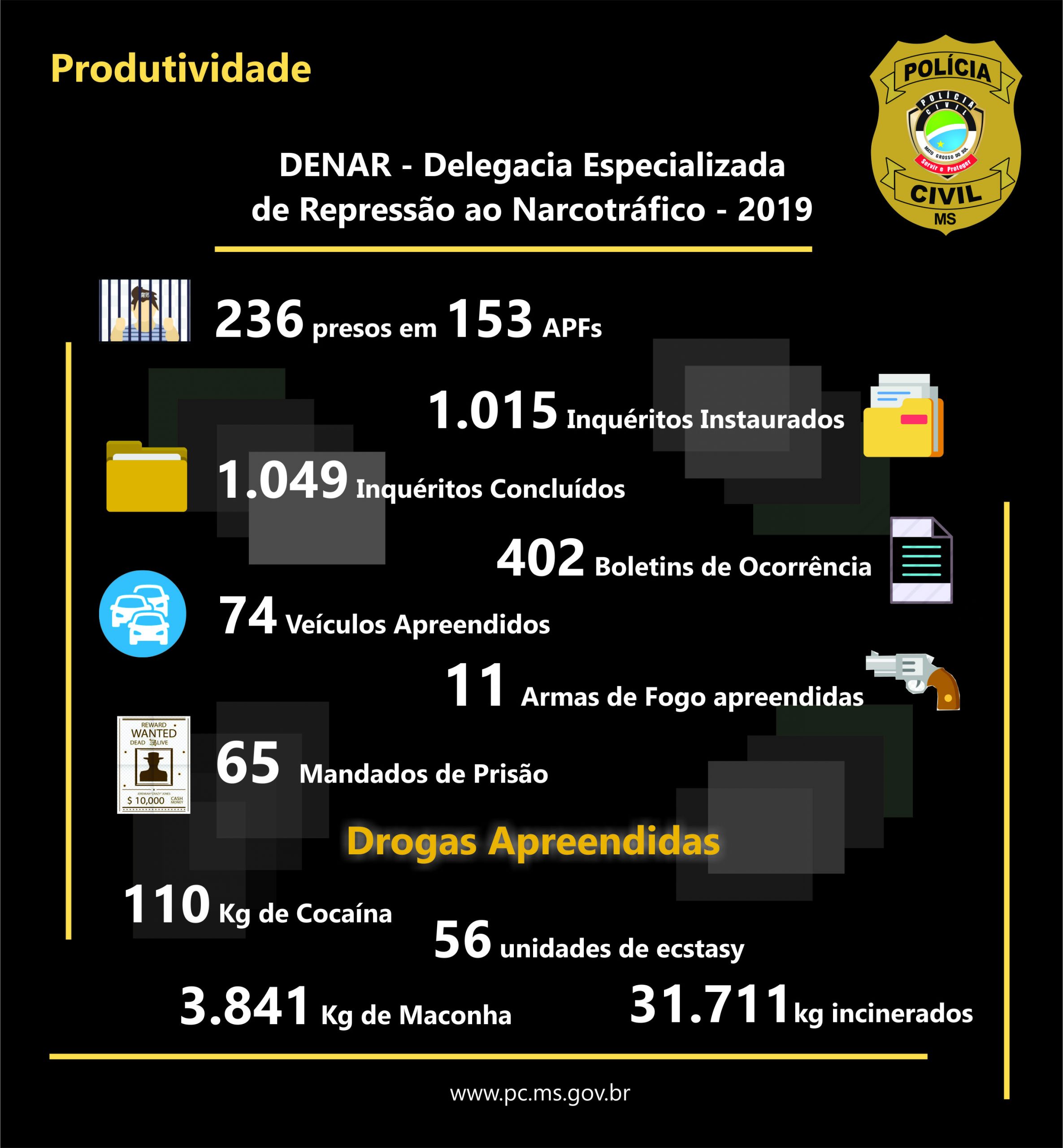Campo Grande (MS): A Delegacia de Repressão ao Narcotráfico – Denar divulgou o levantamento de suas ações no ano de 2019. Ao todo, 236 pessoas foram presas, em 153 Autos de Prisão em Flagrante. A Especializada realizou ainda o cumprimento 65 Mandados