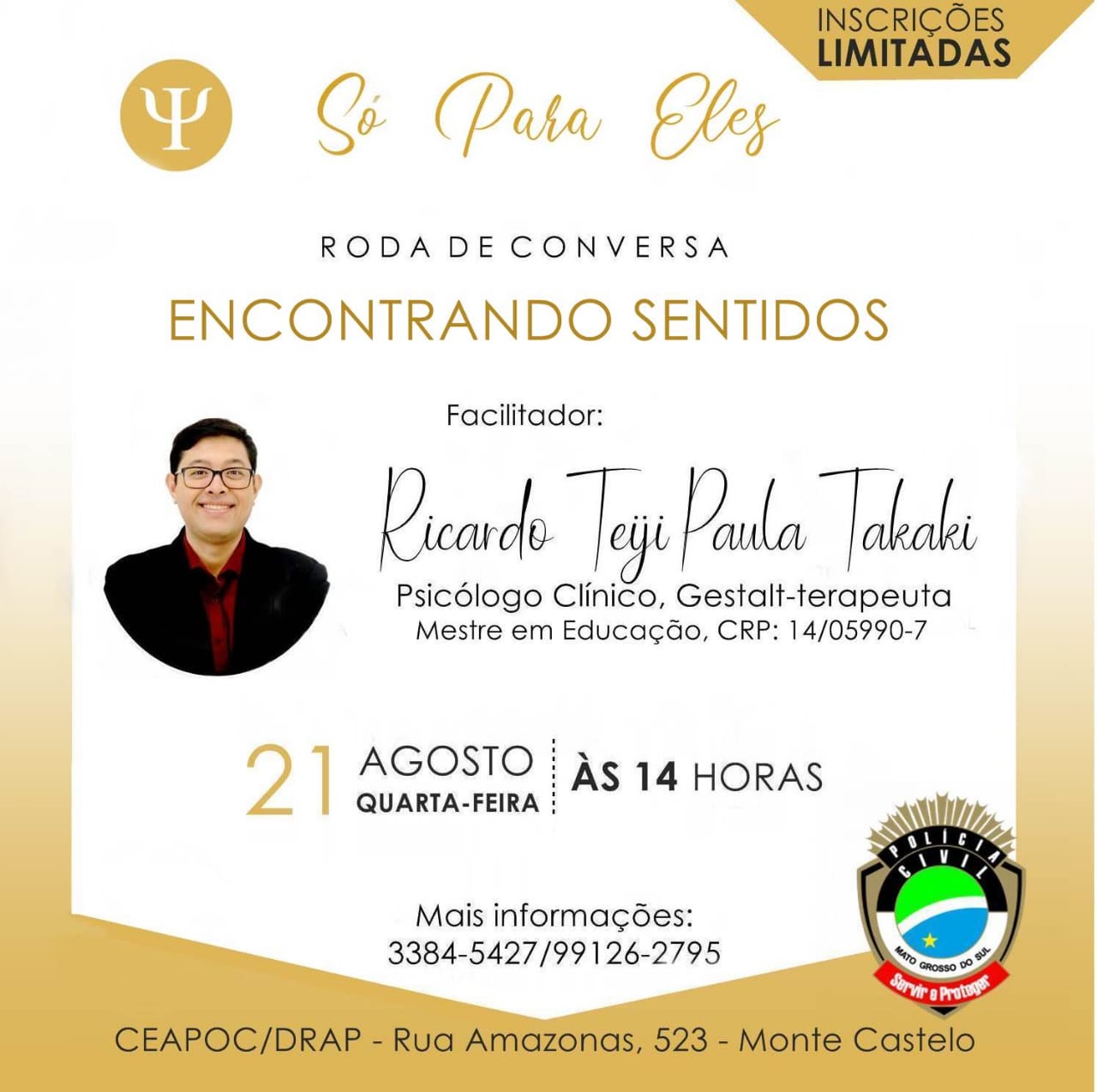 Campo Grande (MS) – A Coordenadoria de Atendimento Psicossocial da Polícia Civil (Ceapoc), promove na próxima quarta-feira, dia 21 de agosto, quarta-feira, às 14h, em Campo Grande, o evento intitulado “Só para Eles”, que tem o objetivo de chamar a