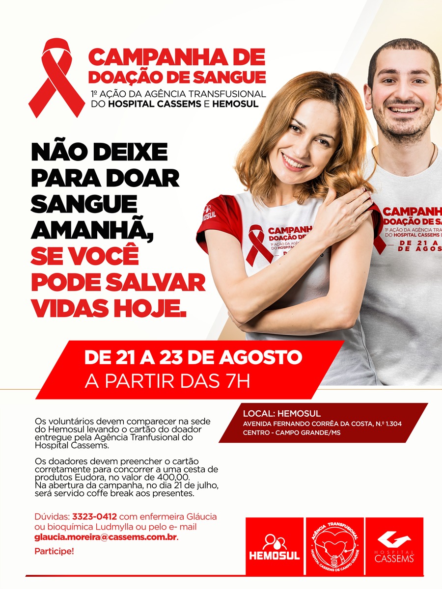 Campo Grande (MS): A Agência Transfusional do Hospital CASSEMS em parceria com o Hemosul realizará nos dias 21, 22 e 23 de agosto a I campanha de Doação de Sangue. A abertura da campanha será no dia 21, às 7h, no Hemosul, localizado na avenida Fernando