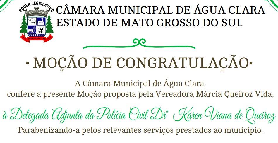 Água Clara (MS) – Durante sessão solene na manhã de ontem (24), na Câmara dos Vereadores, a Delegada Adjunta da Polícia Civil, Dra Karen Viana de Queiroz, recebeu uma Moção de Congratulação, proposta pela vereadora Márcia Queiroz Vida, pelos