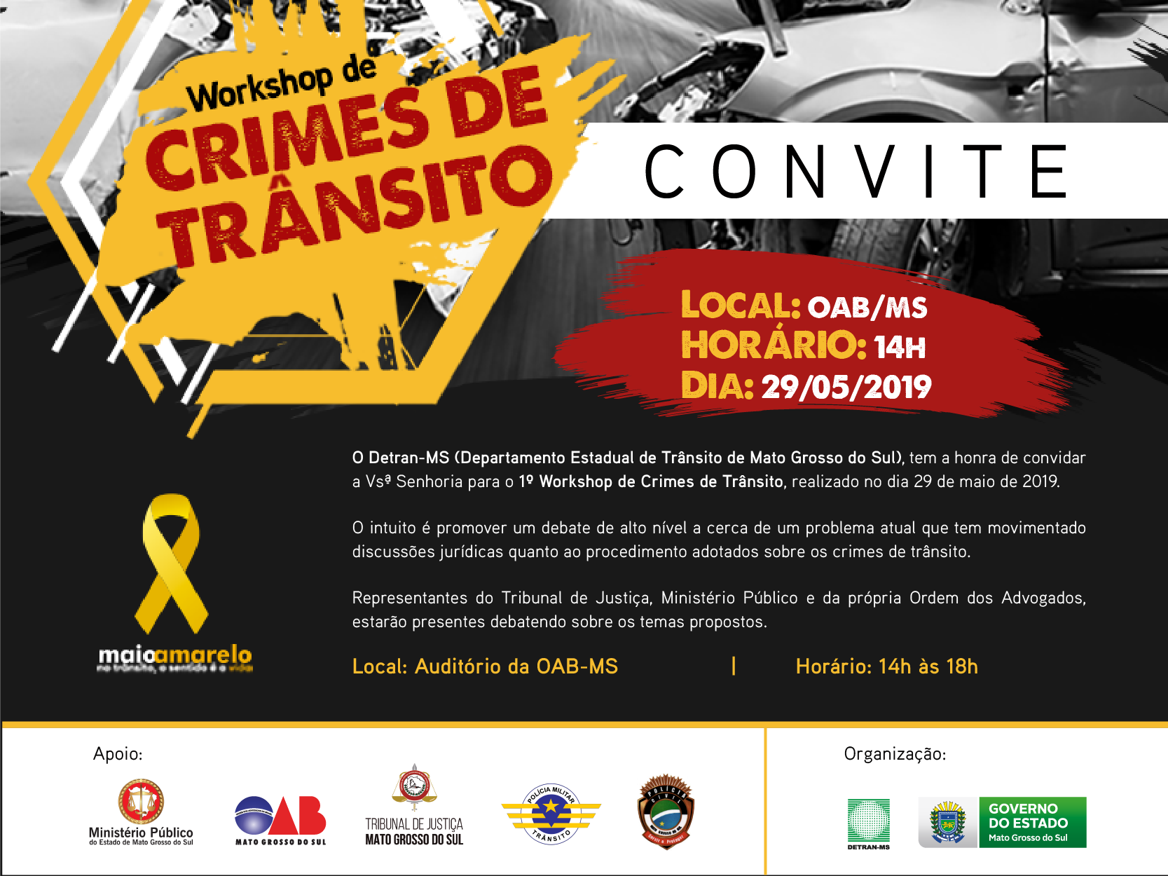 CAMPO GRANDE (MS): Estão abertas as inscrições para o I Workshop – Crimes de Trânsito do Detran-MS (Departamento Estadual de Trânsito de Mato Grosso do Sul). A ação será voltada para profissionais da área e acadêmicos além de encerrar a