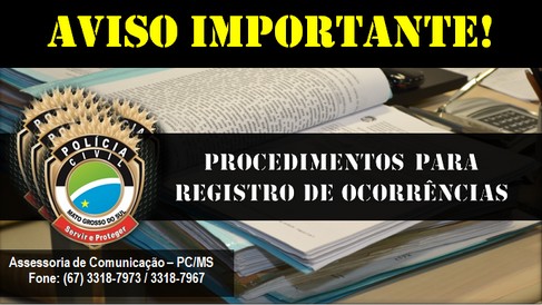 CAMPO GRANDE (MS): O Delegado Geral da Polícia Civil de Mato Grosso do Sul – Dr. Marcelo Lopes Vargas, publicou na edição desta segunda-feira (19) do Diário Oficial do Estado, a portaria nº 128 que dispõe sobre o registro de ocorrências e demais