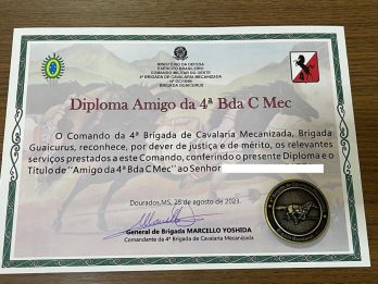 Na manhã desta sexta-feira, 25/08, em formatura alusiva ao Dia do Soldado, a equipe policial civil da DP de Bela Vista recebeu, das mãos do General de Brigada Marcello Yoshida, comandante da 4a Brigada de Cavalaria Mecanizada, diploma de “Amigo da 4a