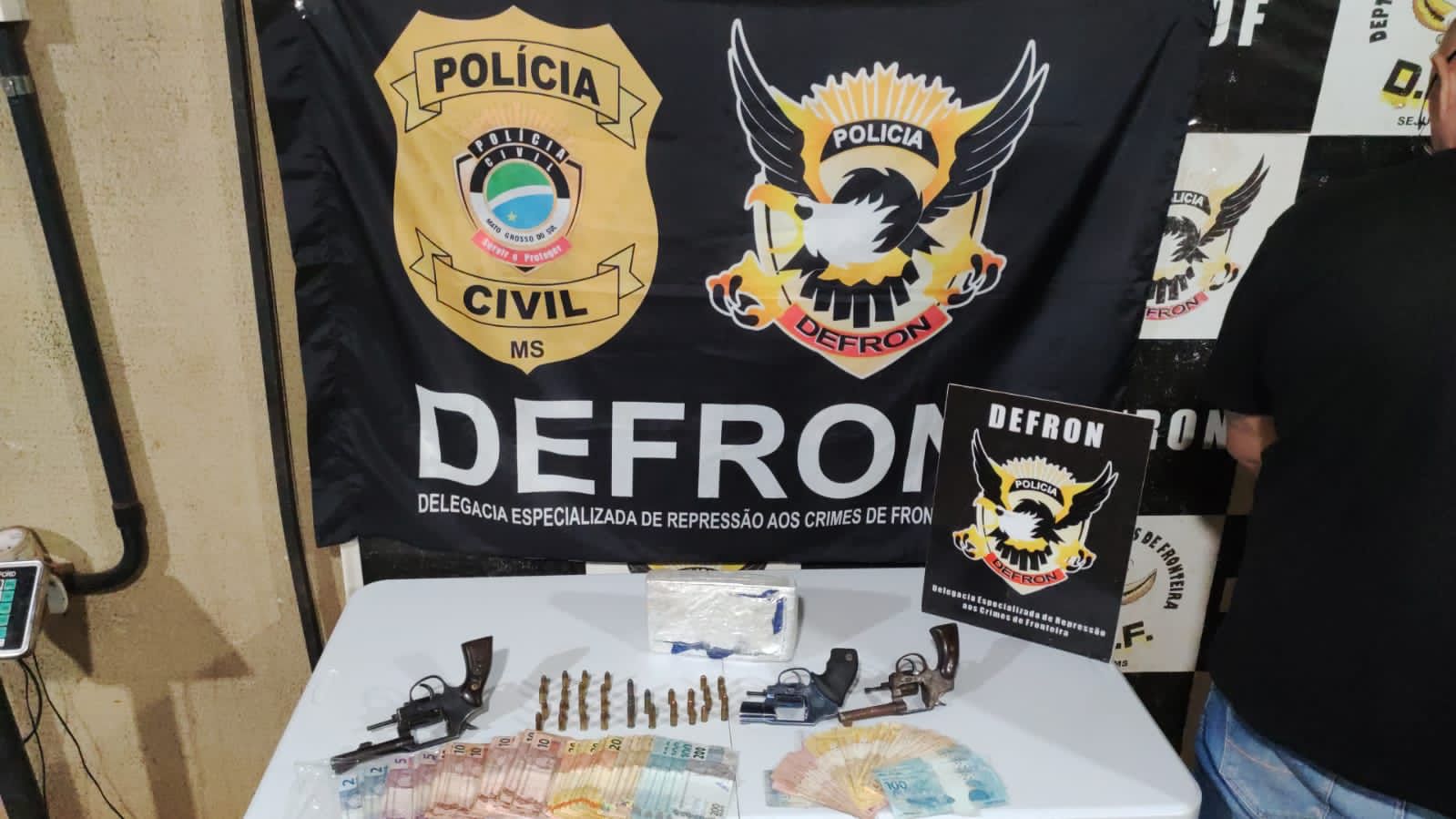 A Polícia Civil, por intermédio da Delegacia de Repressão aos Crimes de Fronteira-DEFRON, apreendeu na tarde de ontem, 1kg de cocaína e três armas de fogo. Três pessoas foram autuadas em flagrante. Os policiais da Especializada receberam a informação