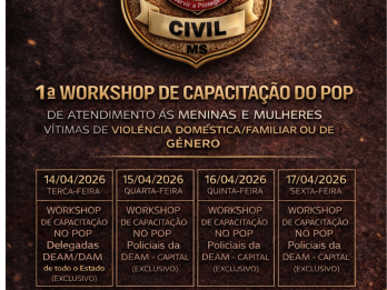 A Polícia Civil de Mato Grosso do Sul realiza, entre os dias 14 e 17 de abril de 2026, o 1º Workshop de Capacitação do Protocolo Institucional de Atendimento às Meninas e Mulheres Vítimas de Violência Doméstica, Familiar ou de Gênero, marcando o