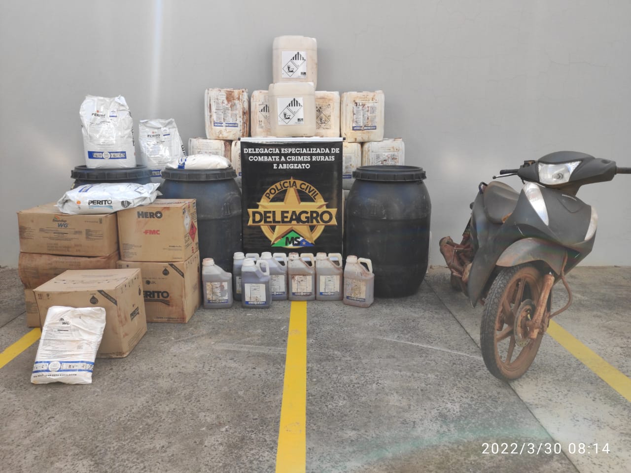 Sidrolândia (MS): A Polícia Civil do Estado de Mato Grosso do Sul, por meio da DELEAGRO prendeu na tarde de ontem, um homem de 49 anos, por manter em depósito para fins de comercialização centenas de litros e dezenas de quilos de agrotóxicos