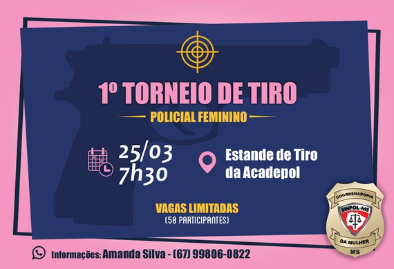 A Coordenadoria da Mulher do Sindicato dos Policiais Civil do Mato Grosso do Sul (Sinpol-MS) realizará o 1° Torneio de Tiro Feminino, no dia 25 de março, a partir das 7h30min, no Estande de Tiro da Acadepol, em Campo Grande. O evento faz parte das