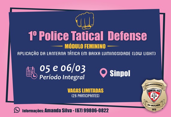 A Coordenadoria da Mulher do Sinpol MS, em parceria com a CET – TACTICAL, realizará o 1° Curso Police Defense (Módulo Feminino), com aplicação da lanterna tática em baixa luminosidade (Low Light), nos dias 05 e 06 de março, em período integral