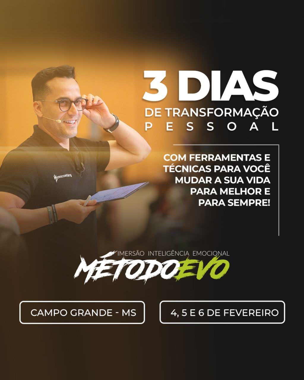 O Centro de Atenção Biopsicossocial da SEJUSP/MS informa que foram disponibilizadas vagas gratuitas a servidores da Segurança Pública de MS para o curso “Imersão Inteligência Emocional Método Evo”, do coach Márcio Micheli, previsto para