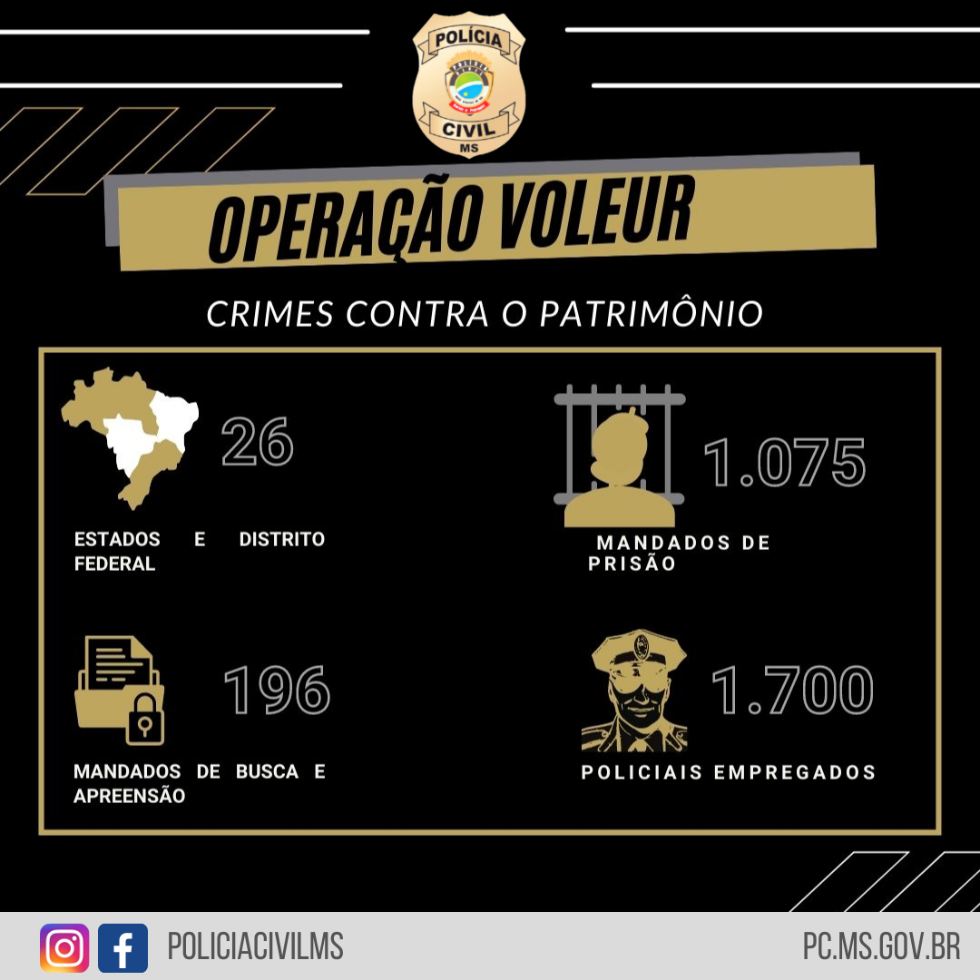Estão em cumprimento mais de 1 mil mandados de prisão e 190 de busca e apreensão nas 27 unidades federativas Polícias civis dos 26 estados e do Distrito Federal deflagraram nesta quarta-feira, 17/11, a Operação Voleur, de repressão a crimes contra o