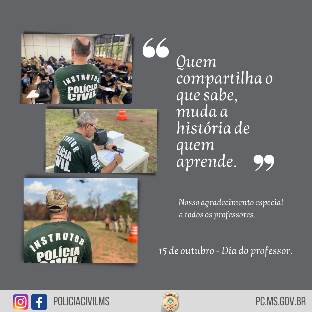 A Polícia Civil do Mato Grosso do Sul parabeniza os professores pela data, em especial, os servidores que desempenham este papel nas salas de aula da Academia de Polícia Civil do Mato Grosso do Sul. Desde que a Polícia Civil do MS foi fundada, já foram