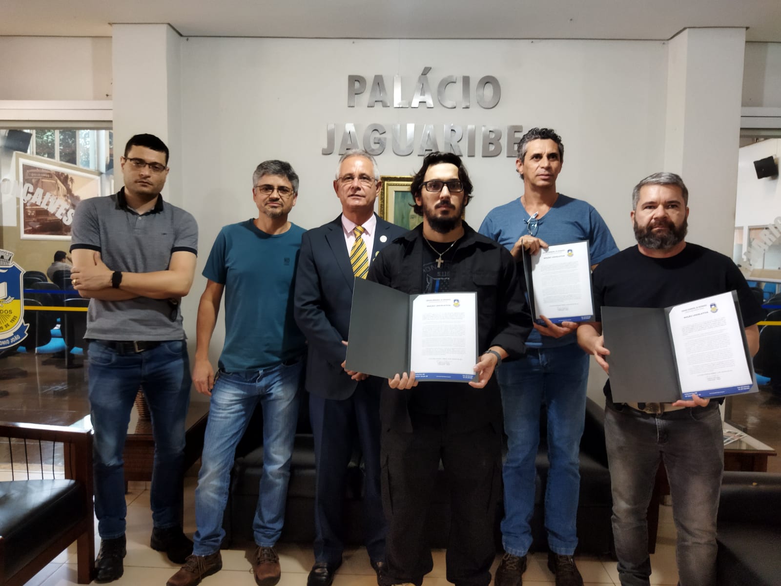 O delegado adjunto da Defron, Erasmo Bruno de Mello Cubas e os investigadores Saulo Soares Filho e Marco Aurélio dos Santos Lima receberam, em nome de toda a equipe, uma moção de congratulação na Câmera Municipal de Dourados. A solenidade aconteceu