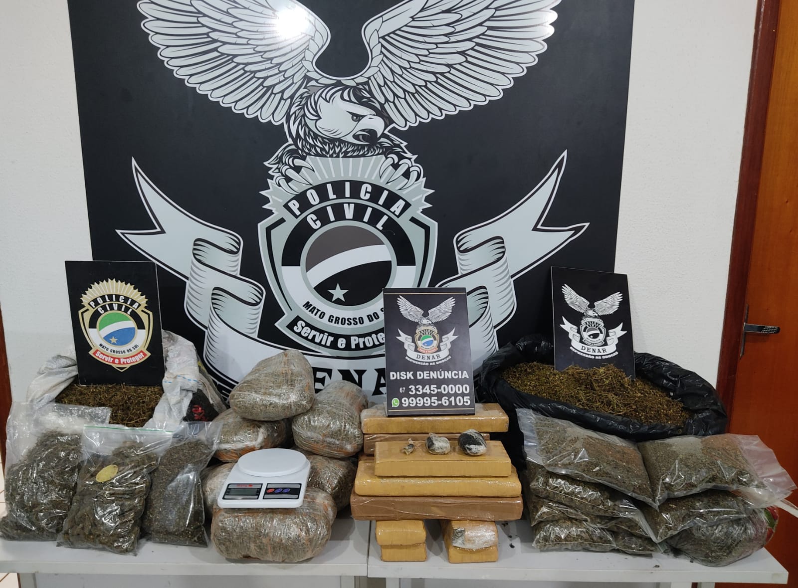 Dourados (MS): A Polícia Civil, por meio da Delegacia Especializada de Repressão aos Crimes de Fronteira-Defron, em atuação conjunta com a 2ª Delegacia de Polícia de Dourados, apreendeu uma pistola calibre .45, 164,400 quilos de maconha, 3.300 quilos de