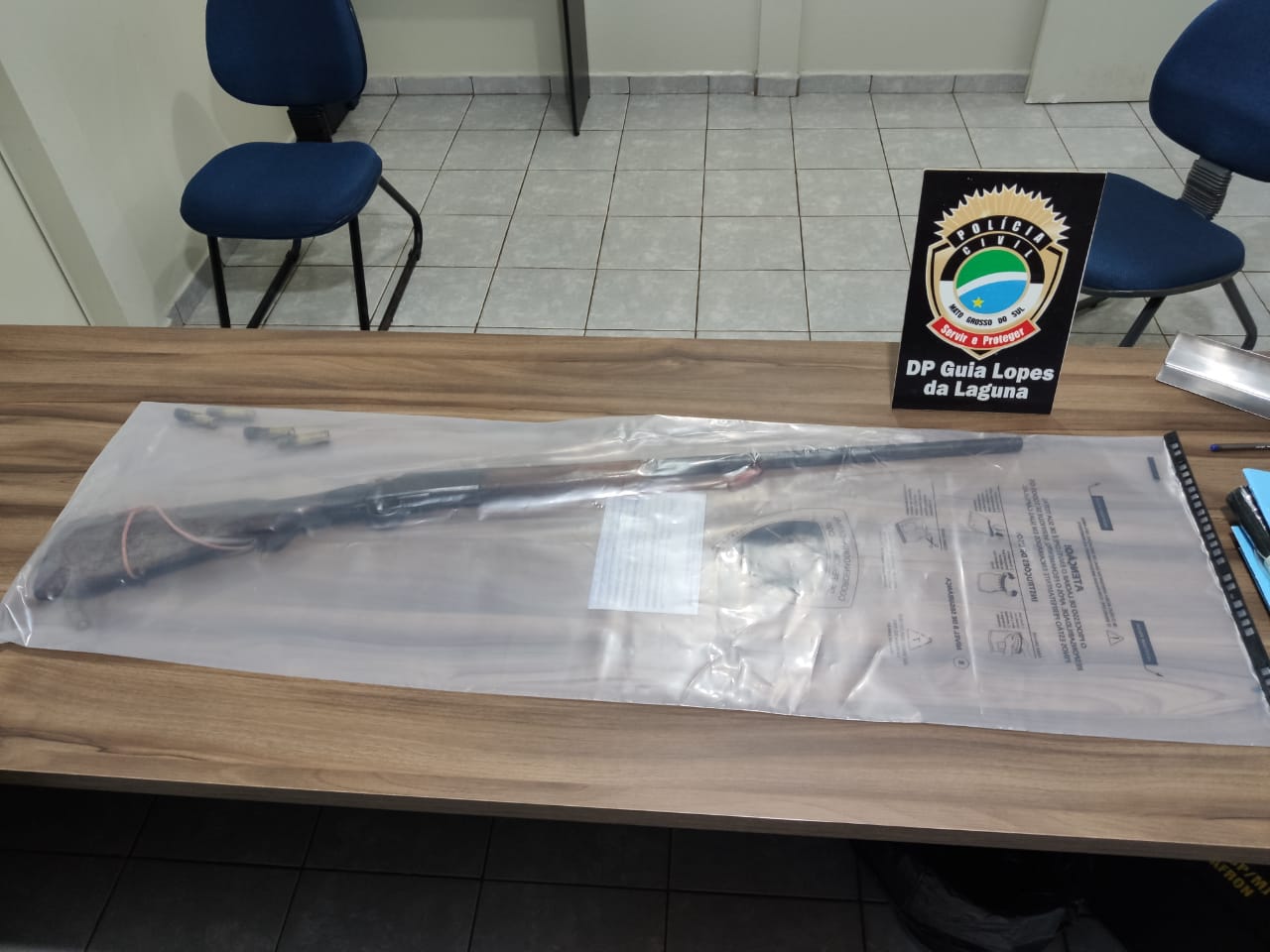 Guia Lopes da Laguna (MS): Na tarde desta segunda-feira (31), policiais da Delegacia de Polícia Civil de Guia Lopes apreenderam, em uma chácara na zona rural, uma espingarda cal. 32, acompanhada de três munições. A apreensão se deu no cumprimento de um