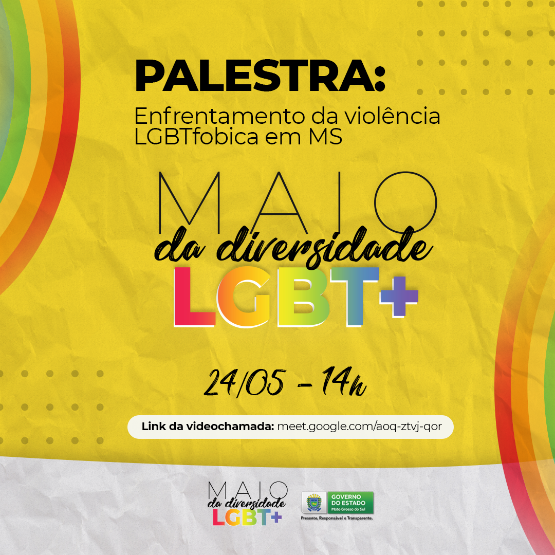 Maio é o mês da diversidade LGBT+ e nesta segunda feira (24), às 14h, acontece a palestra Maio da diversidade LGBT com o tema Enfrentamento da violência LGBTfóbica em MS. A palestra pode ser acessada pelo Google meet no link