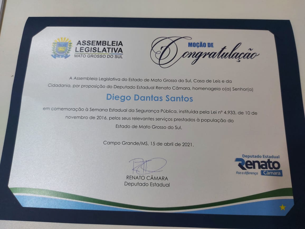 Sidrolândia (MS): Na manhã de hoje (13), os Delegados de Polícia, Investigadores e Escrivães, da Delegacia de Sidrolândia receberam Moções de Congratulações da Assembleia Legislativa, em comemoração à Semana Estadual de Segurança Pública, pelos