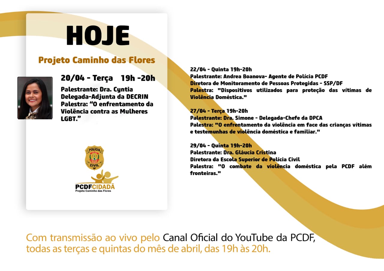 A Escola Superior da Polícia Civil do Distrito Federal/PCDF promove hoje (19), a 4ª palestra do Projeto Caminho das Flores com o tema: “O enfrentamento da Violência contra as Mulheres LGBT”, com a Dra. Cyntia, Delegada-Adjunta da DECRIN, a partir das