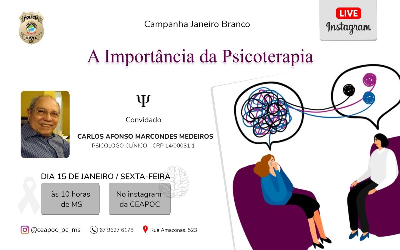 Campo Grande (MS): A Coordenadoria de Atendimento Psicossocial da Polícia Civil (Ceapoc) convida os servidores e familiares para assistirem, nesta sexta-feira (15) às 10h00, a live que ocorrerá no Instragram da Ceapoc ( @ceapoc_pc_ms) com o