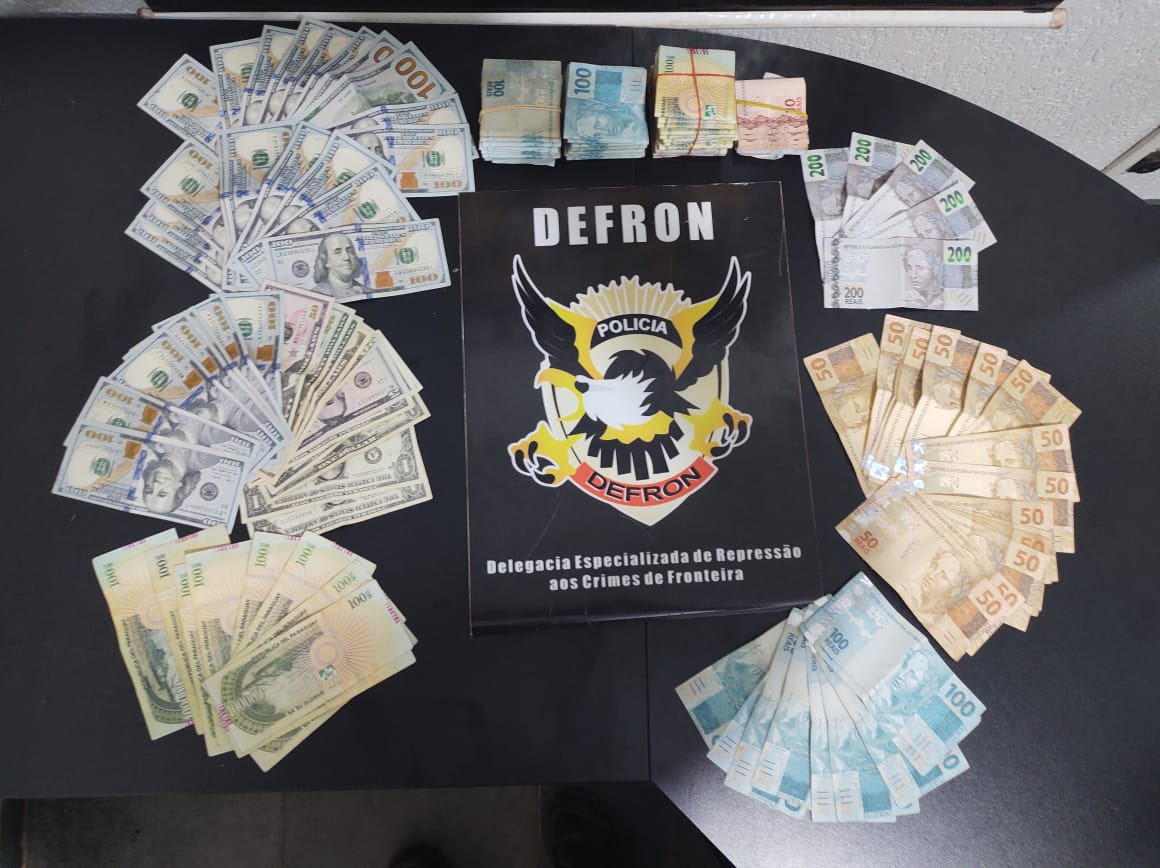 Dourados (MS): A Polícia Civil, através da Delegacia de Repressão aos Crimes de Fronteira (Defron), flagrou na tarde desta segunda-feira (21), um casal em posse de grande quantia em dinheiro, distribuídos em moedas nacional e estrangeira, em uma rodovia