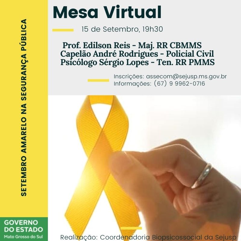 A Coordenadoria Biopsicossocial da Secretaria de Estado de Justiça e Segurança Pública (Sejusp), promove na próxima terça-feira (15), às 19h30, uma Mesa Virtual para debater a importância da valorização da vida, dentro da programação do Setembro