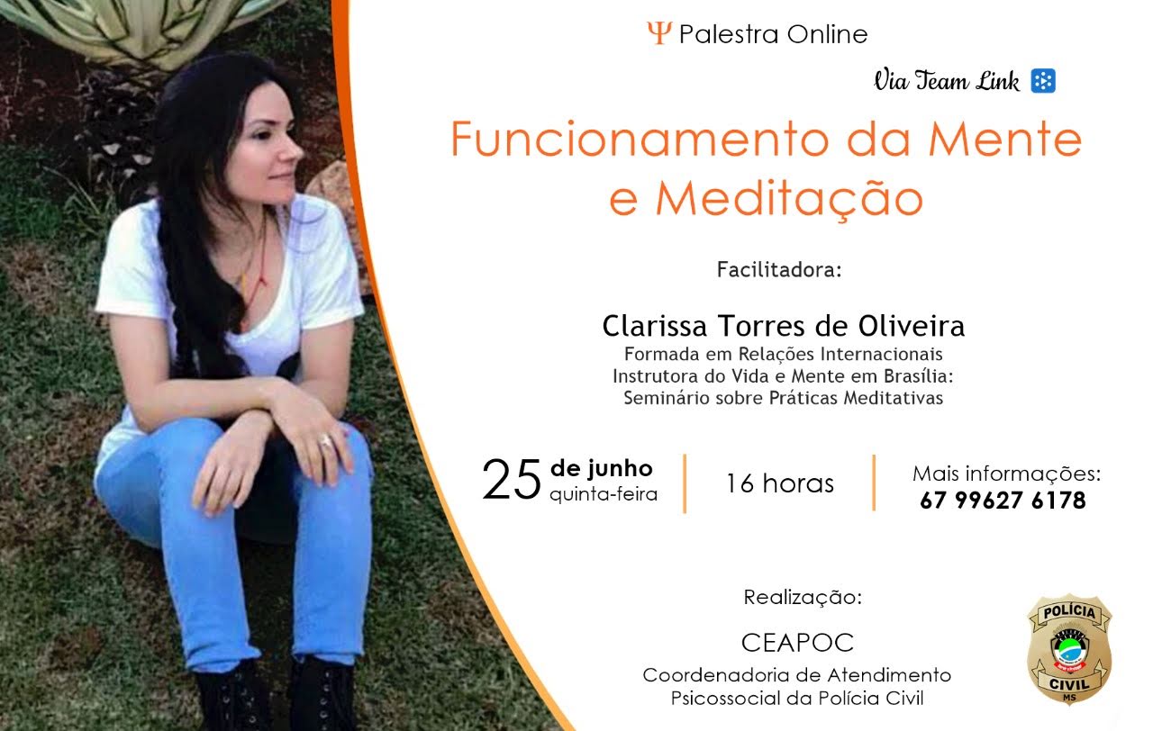 Campo Grande (MS): A CEAPOC convida os servidores interessados a participarem da videoconferência do programa: Investigando a mente: estudos e práticas de meditação. O encontro da semana será ministrado pela Instrutora de Meditação de Brasília,