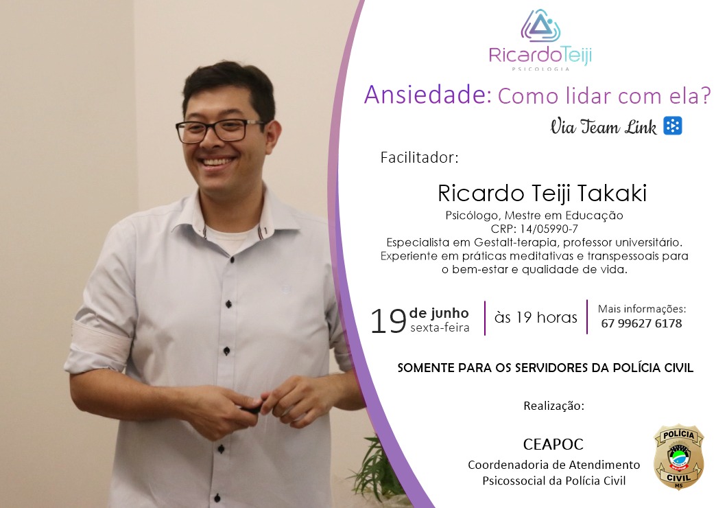 Campo Grande (MS): A Coordenadoria de Atendimento Psicossocial da Polícia Civil – CEAPOC convida os servidores interessados a participarem da palestra por vídeo conferência: “ANSIEDADE: Como lidar com ela?” Que será ministrada pelo